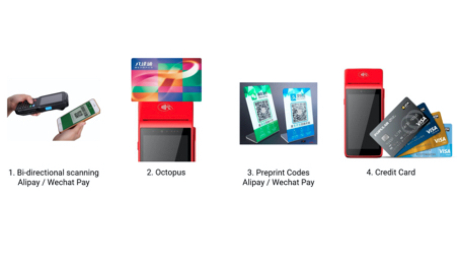 備有磁帶信用卡、晶片信用卡及近距離通訊(NFC)讀卡器,並裝置了QR碼掃描器,方便以手機錢包進行交易,裝置亦有列印單據功能。 支援的付款方法有: 八達通、支付寶及微信支付、及Visa, Mastercard 和銀聯信用卡。