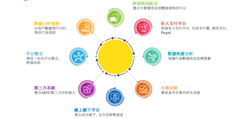 如透過Wechat pay及Alipay收款,都可立即透過結算中心計算匯率,非常方便。另外,系統也整合了中郵電商及順豐跨境物流平台,網店的貨品如需運到內地在物流上即可即時安排。
